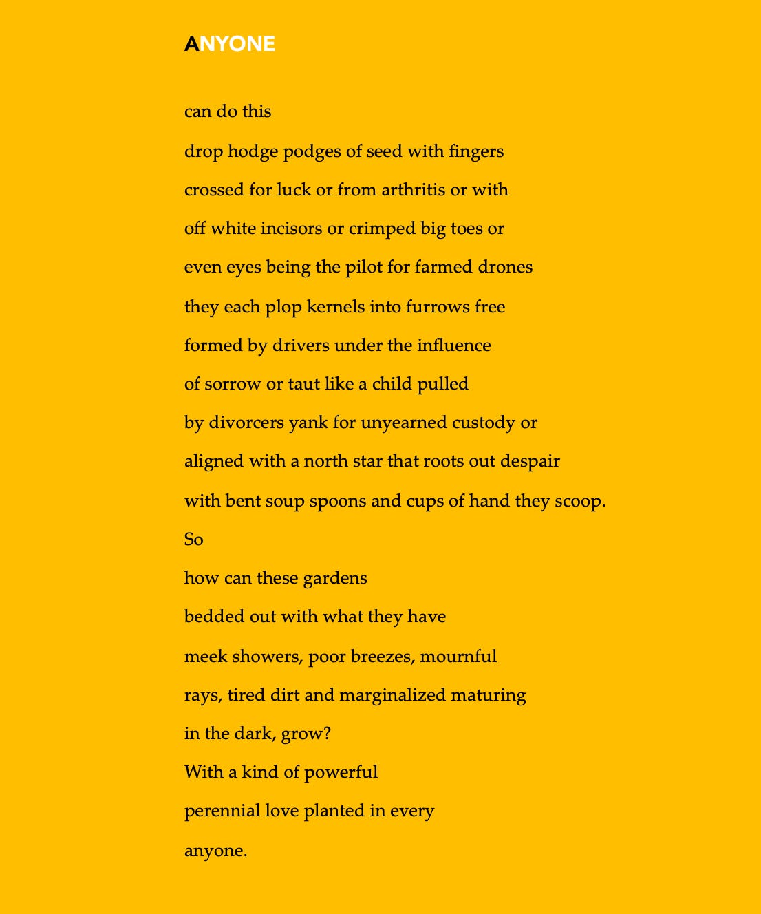 The world stage has the leading roles now taken by people driven only by power and a moral vacuum. This poem aims to counter this misperception by using the ‘how does our garden grow’ metaphor to express how the human capacity to plant and grow a loving world lives in each of us. Being humble, gentle, patient, just and compassionate are the enduring attributes for meaningful strength and purpose to take root. Please click on arrow to hear poem, Anyone.
