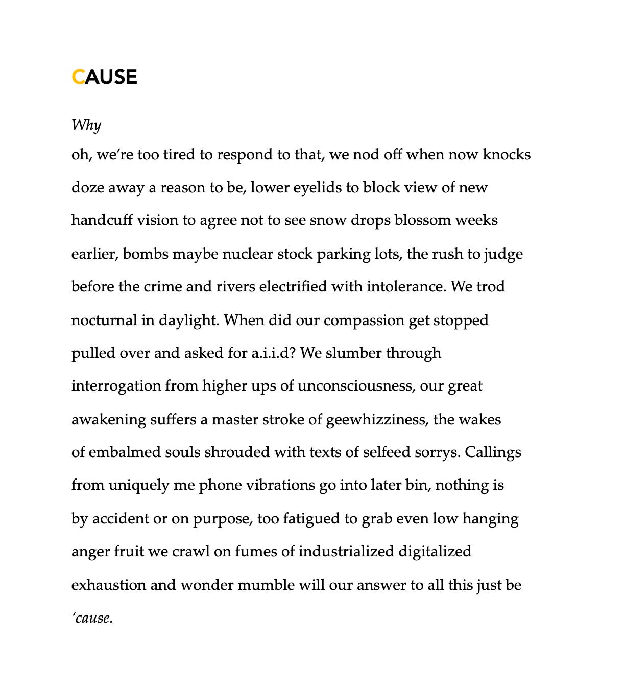 A long time ago in a galaxy far, far away, I took my master’s degree in poetry and attempted to apply it to the world of profits and non-profits. I started a business dedicated to helping organizations unearth, capture and communicate their noble purpose (with the emphasis on noble). Guided by the trademarked ‘A business isn’t a brand to be built, but a caused to be believed in’, the key was to truthfully answer the question ‘why we are here’ versus ‘what we do’. The work was rewarding and meaningful and provided the privilege of meeting thought and action leaders who yearned to make, in their unique way, the world a better place. This search for purpose continues today, only now I am led by the cause of deepening and widening the distribution of poetic wealth. How can something poetic make the world a better place, or, even make one life a little better? In a time where there are seemingly infinite and exhausting demands and temptations for attention, how can this message get noticed, let alone have an effect? Likewise, how do you continue to live your ‘why’ in this attention grabbing world? Please click on arrow to listen to poem ‘Cause’.